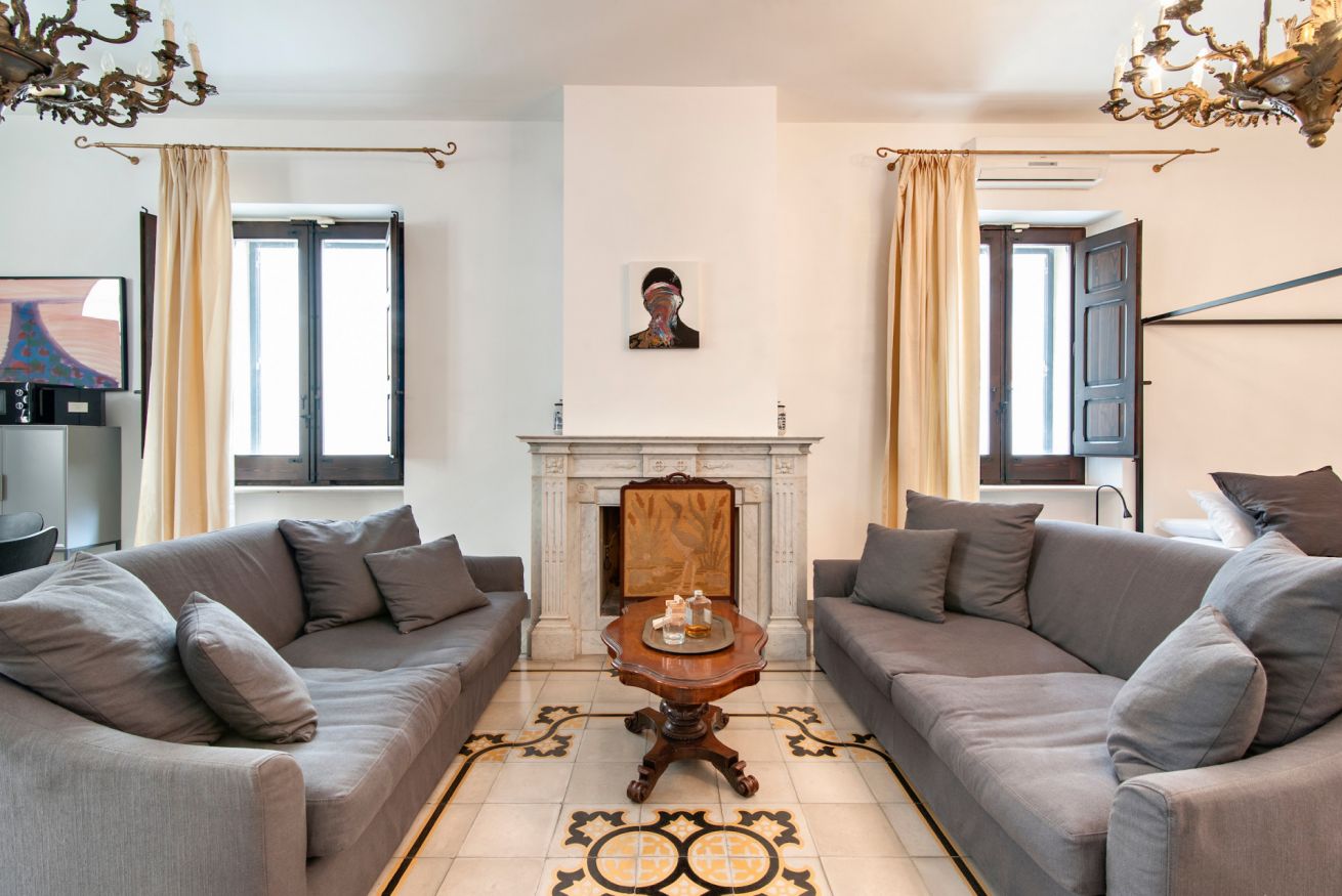 Un salottino con caminetto, perfetto per creare un ambiente caldo e suggestivo, dove godersi un momento di tranquillità.