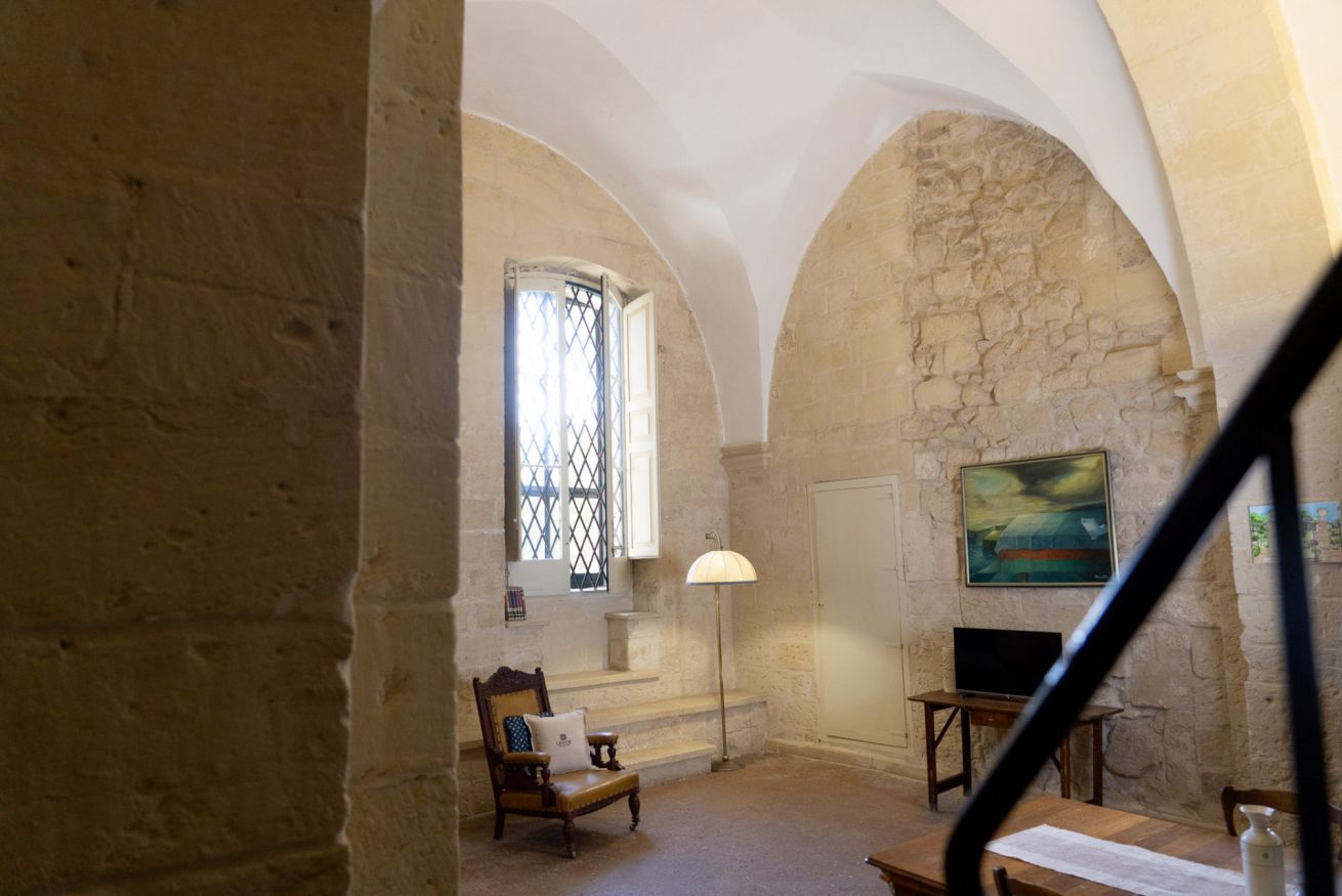La cura dei dettagli è ovunque: lampade artigianali, quadri, libri antichi e complementi d’arredo scelti con attenzione per valorizzare l’autenticità del luogo.