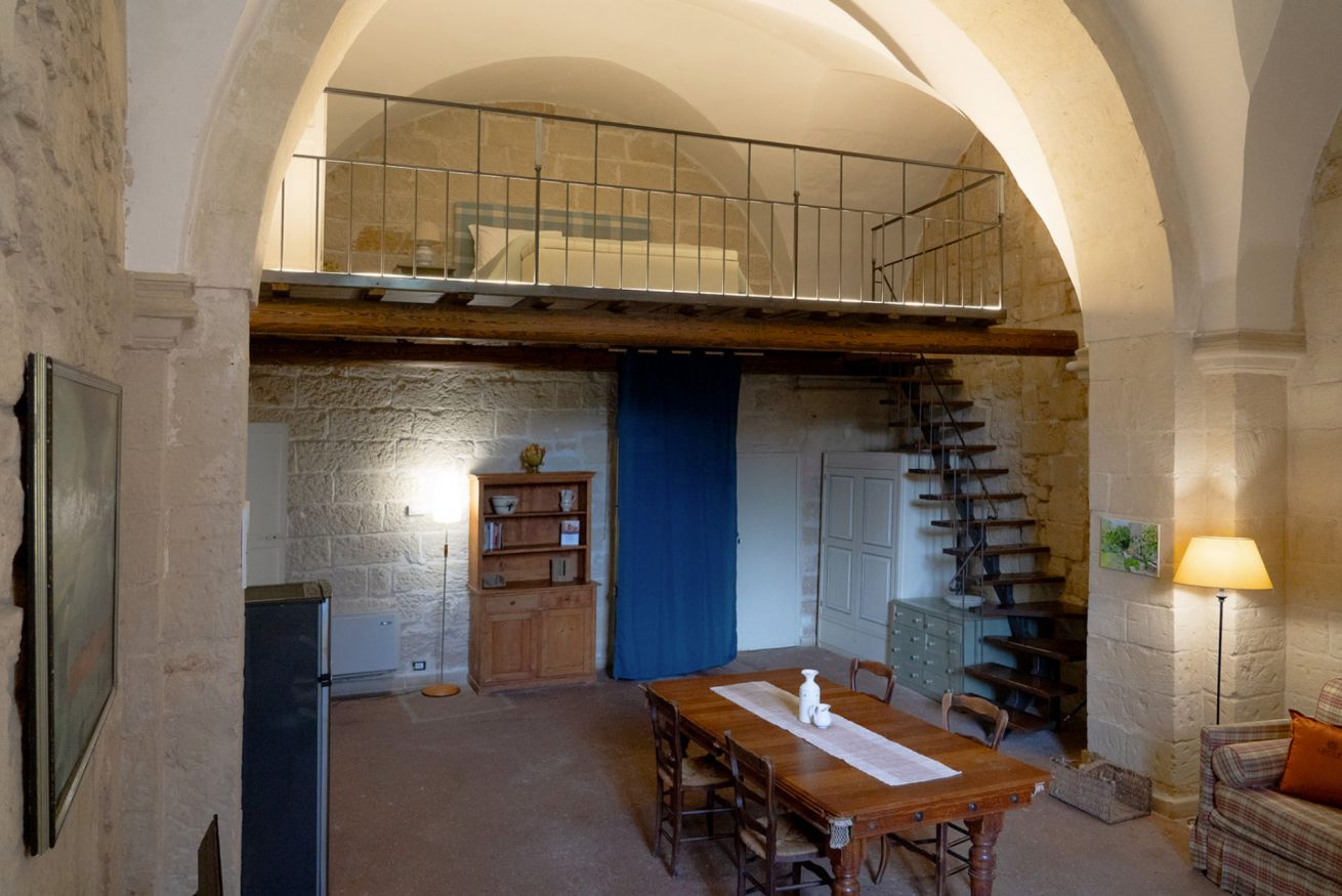 Una scala interna conduce alla camera da letto matrimoniale, posta in un suggestivo soppalco: