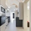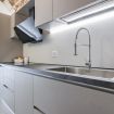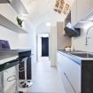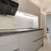 La cucina è arredata con mobili moderni, una zona pranzo con sedie, completa di frigorifero, freezer, forno elettrico e microonde, lavastoviglie, macchina per il caffè e bollitore elettrico.